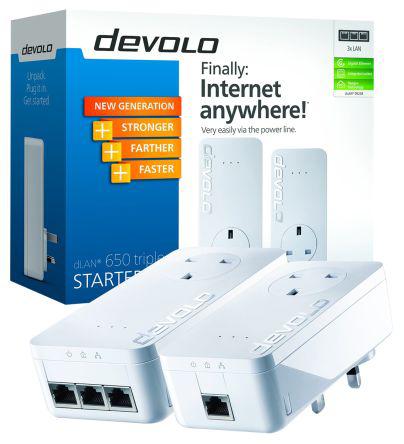 This is dLAN 650 triple+ Starter Kit Powerline Adapter manufactured by Devolo. The manufacturer part number is 9238. The given dimensions of the product include 188.5 x 78.5 x 231mm. The typical product's weight is 560g. This product features 4 number of ports. In addition, the number of adapter supplied 2 . The plug is a highly reliable type g with long service life. In addition, the height is 231mm. Furthermore, the product is 188.5mm wide. The product comes in 78.5mm depth. It is offered with 600mbit/s maximum powerline speed . It has a model dlan 650 triple+ starter kit. It allows rj45 connection type.