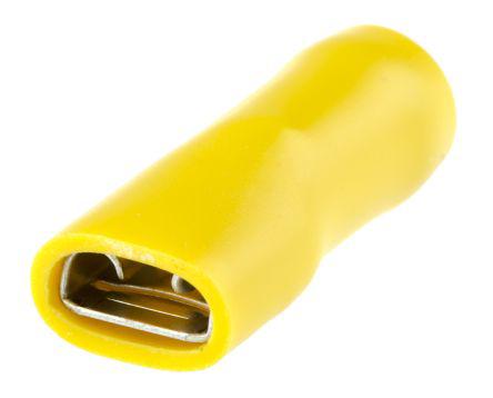 This is 38 Series Yellow Insulated Crimp Receptacle 6.3 x 0.8mm 2.5mm² to 6mm² 12AWG to 10AWG Tin Plated manufactured by RS Pro. The manufacturer part number is 383638VH. The wire has a maximum size of 6mm². In addition, female is the available "Gender" of the product. It has a decent yellow colour. While the minimum wire size AWG includes 12awg. tab Connector type offer robust functionality. Its accurate length is 24mm. Its tab size is about 6.3 x 0.8mm . It has a robust vinyl insulation material. The high-quality tin is used as contact plating material. The product 38, is a highly preferred choice for users. Insulation Option: insulated. Its maximum wires size includes 10awg. On the other hand, the wire has 2.5mm² of minimum size. The product is made from sturdy brass materials.