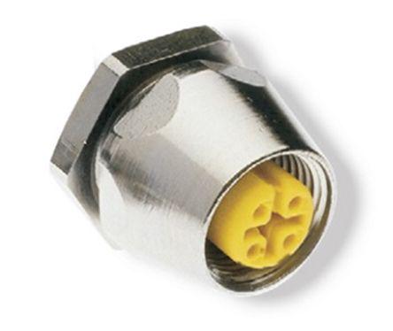 This is FKV Series 5 Pole PCB Mount M12 Connector Plug with Female Contacts IP68 manufactured by Turck. The manufacturer part number is FKV 4.5. The product has a current rating of 4a. It is a type of threaded mating. The product is available in pcb mount configuration. It is IP rated with ip68. Whereas, the minimum operating temperature of the product is -40°c. The product fkv, is a highly preferred choice for users. It has straight body orientation. Moreover, the product has a nominal 250 v voltage rating. This female contact is widely suited for specific applications. The product also features robust stainless steel housing material. It comprises a plug. The connector has m12 size. The high-quality gold is used as contact plating material. It allows solder termination method. The product contains 5 contacts. It has a maximum operating temperature of +105°c. The product is made from sturdy brass materials.