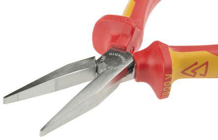 This is 160 mm Chrome Vanadium Steel Long Nose Pliers with 46.5mm Jaw Length manufactured by Knipex. The manufacturer part number is 3016160. It jaw is about 46.5mm in length . VDE/1000V Approval Options - yes. The product is made from highly stable and reliable chrome vanadium steel. It has an overall length of 160 mm.