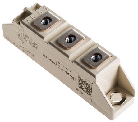 This is Diode Module 800V 82A 3-Pin Semipack1 manufactured by Semikron. The manufacturer part number is SKKD 81/08. The given dimensions of the product include 30 x 93 x 20mm. The product is available in panel mount configuration. The product utilizes silicon junction diode technology. It has a maximum operating temperature of +125 °c. Moreover, a bespoke product has 2ka peak non-repetitive forward surge current. It features 1.55v of maximum forward voltage drop. In addition, the height is 30mm. It has a typical 450µa peak reverse current . Furthermore, the product is 20mm wide. Its accurate length is 93mm. The package is a sort of semipack1. It consists of 1 elements per chip. Whereas, the minimum operating temperature of the product is -40 °c. Furthermore, its maximum continuous forward current constitutes 82a. The diode features a single configuration. It contains 3 pins. While having the peak reverse repetitive 800v.