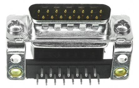 This is AMPLIMITE HD-20 Series 15 Way Right Angle Through Hole PCB D-sub Connector Plug with Mounting Screw manufactured by TE Connectivity. The manufacturer part number is 5745435-8. The product contains 15 contacts. It has mounting screw hardware mounting . The product is available in through hole configuration. In addition, male is the available "Gender" of the product. It has right angle body orientation. The product also features robust thermoplastic housing material. The high-quality gold is used as contact plating material. The product amplimite hd-20, is a highly preferred choice for users. The product is made from sturdy brass materials. It carries [Serial Number] serial number.