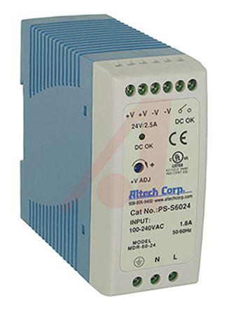 This is PS-S 60W Switch Mode DIN Rail Power Supply 24V dc/ 2.5A manufactured by Altech. The manufacturer part number is PS-S6024. The product has 70°c maximum temperature. It has a/an dc output voltage . While its minimum temperature is -20°c. It has ac input voltage. Furthermore, the product is 40mm wide. The MTBF values include 299.2kh. Its output voltage (maximum) includes 24v dc. Its electrical phase configuration includes 1. It provides robust protection features, such as over voltage protection, overload protection, short circuit protection. It comes in switch mode configuration. Additionally, its holdup time is about 20 (115 v ac) ms, 50 (230 v ac) ms . While its maximum input current includes 1.8a. It has 47 → 63hz input frequency range . It is a highly efficient product with an 88% of high efficiency. Its input voltage is 85 → 264v ac. Additionally, the product is supplied with 1 outputs. It has 24 → 30v of output voltage adjustment range. Has a line regulation of ±1%. Carries 150mv pk-pk ripple and noise. It features ps-s range. The product features 24v dc minimum output voltage. The product also provides special features, such as cooling by free air convection, led indicator. It has a single phase input electrical phase . In addition, it has ac/dc-dc type power signal conversion . The product is available in din rail configuration. It carries 2.5 a output current. Applications Information involves industrial. The product ps-s60, is a highly preferred choice for users. The product comes in 100mm depth. In addition, the height is 90mm. The typical product's weight is 0.33kg. Features a 24 v dc output voltage. Feature 60w of power rating. 264v ac is the maximum voltage of the bespoke product. The product has 85v ac of minimum input voltage.