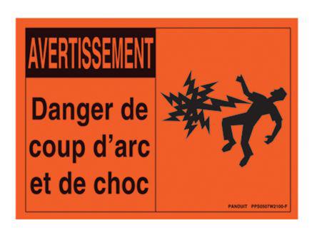 This is Danger High Voltage Sign with French Text Polyester 177.8 x 127mm 1 Hazard Warning Label manufactured by Panduit. The manufacturer part number is PPS0507W2100-F. Its text message shows potential arc flash hazard . It has a decent black, orange colour. The product is made from highly stable and reliable polyester. In addition, the height is 127 mm. Furthermore, the product is 177.8mm wide. It contains 1 item per package . However, its text language is french . In addition, it displays danger high voltage sign description .