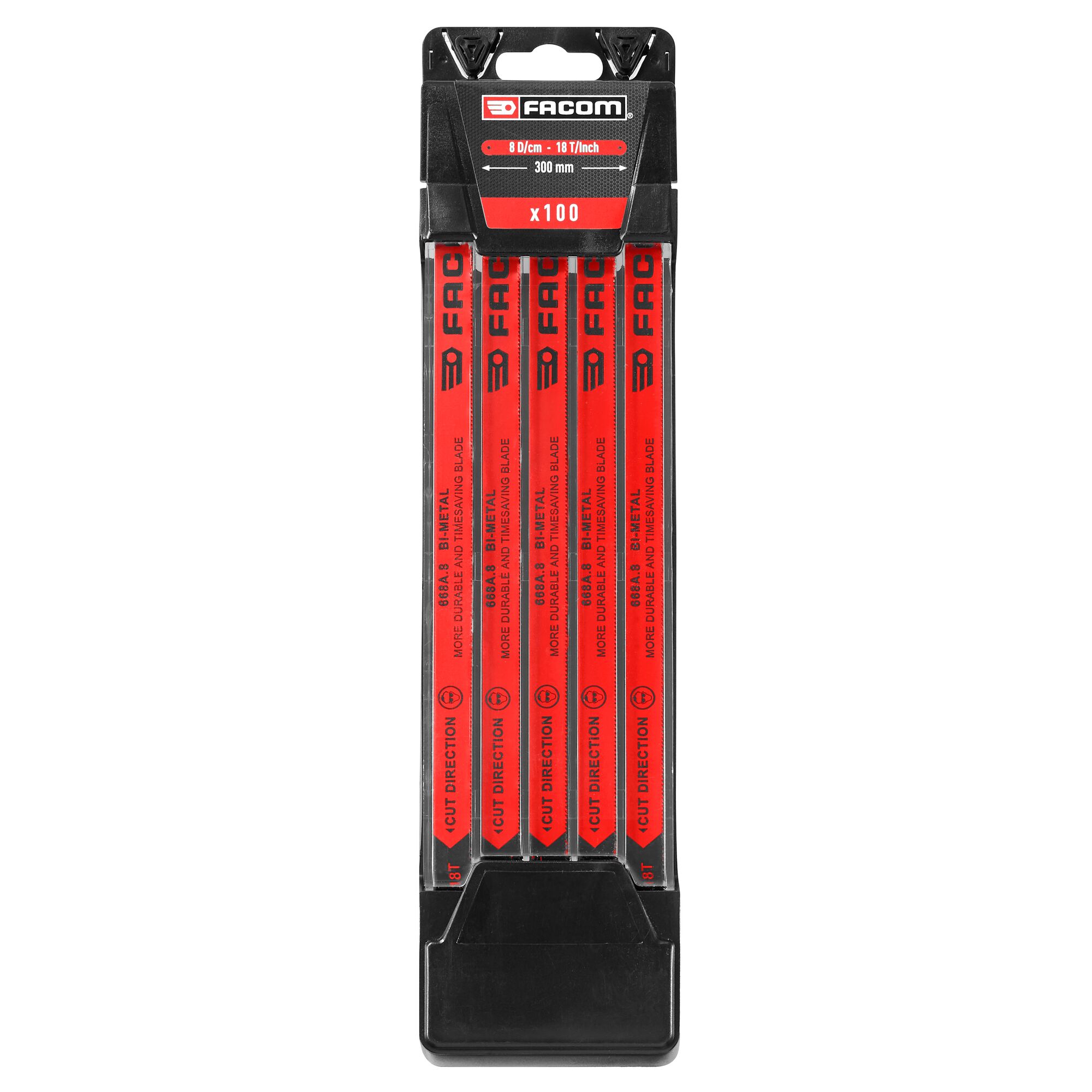 This is 300 mm Cobalt Steel Hacksaw Blade 18 TPI manufactured by Facom. The manufacturer part number is 668A.8PB. It has 8 number of teeth per inch . It is designed with a hacksaw blade type saw blade . It is offered with a standard blade thickness about 6mm . The product is made from highly stable and reliable bi-metal. The blade has a length of 300 mm. It is offered to cut metal materials . The product consists of 100 pieces.