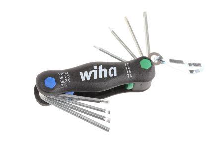 This is 8 piece Folding Key Set Chrome Vanadium Steel manufactured by Wiha Tools. The manufacturer part number is 27939. A quality product with a nice electro plated finish. The product is made from highly stable and reliable chrome vanadium steel. This is a type of mixed, a set with user-desired tools. It has an overall length of 120 mm. Moreover, it has torx: t4; t5; t6; t7; slotted: 1.5; 2 mm; phillips: ph00; hexagon: 2 mm set contents . The product consists of 8 pieces.