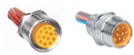 This is RSF Series 9 Pole Panel Mount Connector Socket IP68 Male Contacts Threaded Mating manufactured by Turck. The manufacturer part number is RSF 96-0.3M/14.5/NPT. The product has a current rating of 7a. It is a type of threaded mating. The product is available in panel mount configuration. It is IP rated with ip68. Whereas, the minimum operating temperature of the product is -40°c. In addition, female is the available "Gender" of the product. It has straight body orientation. Moreover, the product has a nominal 600 v voltage rating. This male contact is widely suited for specific applications. It allows solder termination method. The product also features robust brass housing material. The high-quality gold is used as contact plating material. The product rsf, is a highly preferred choice for users. The product contains 9 contacts. It has a maximum operating temperature of +105°c. The product is made from sturdy brass materials.