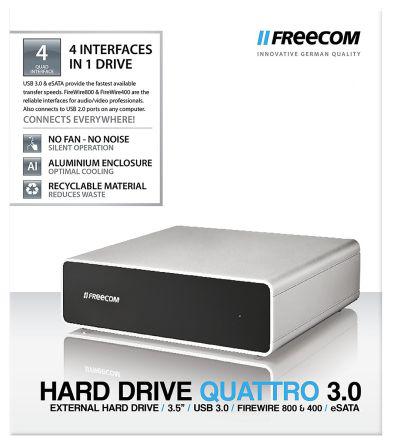 This is Quattro Silver 5 TB Portable Hard Drive manufactured by Freecom. The manufacturer part number is 56333. The module has the capacity of 5 tb. The given dimensions of the product include 155 x 148 x 43mm. The typical product's weight is 1400g. Moreover, it has a/an esata, firewire, usb 3.0 cable interface . It has a decent silver colour. It includes cache about 8mb . In addition, the height is 43mm. Moreover, the product gets power from ac adapter. Furthermore, the product is 148mm wide. Its accurate length is 155mm. It has a/an 2.5in drive form factor . It has a model quattro. It provides maximum rpm up to 5400.