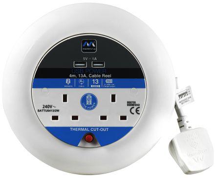 4m Extension Reel Type G - British, USB,2+2 Socket ,Unwound Current Rating 13A,230 V ac,White