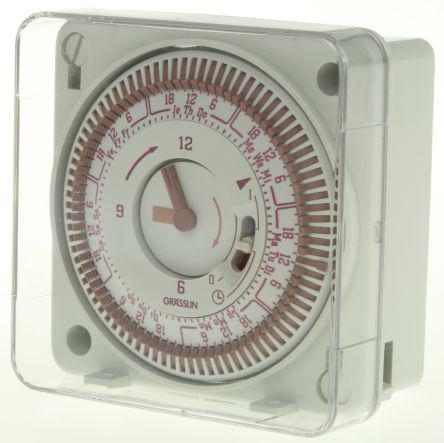 This is 1 Channel Analogue Surface Mount Timer Switch Measures Hours Minutes 220 → 240 V ac SPDT manufactured by Grasslin. The manufacturer part number is TACTIC 171.2. It measures in hours, minutes units . Its segment length is approximately 2 (weekly) h, 15 (daily) min . In addition, the height is 72mm. The product comes in 34.5mm depth. It is supplied with 1 channels. Features 220 → 240 v ac supply voltage. The contact is equipped with spdt configuration. It comes in analogue configuration.