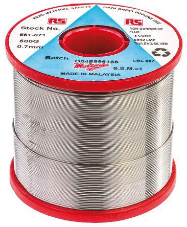 This is 0.7mm Wire Lead solder 179°C Melting Point 36% Lead 62% Tin 2% Silver 500g manufactured by Multicore. The manufacturer part number is 291336. It has 62% tin . It is made using 36% lead . It has a melting point of +179°c. The product is in wire form . The wire has 0.7mm diameter. It has a model number 362. It is a rosin based flux. It includes 2% silver . Its flux content is about 3% . The overall weight of the product is about 500g .