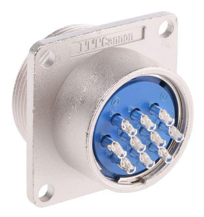This is 10 Pole Panel Mount Connector Socket 21 Shell Size Male Contacts manufactured by ITT Cannon. The manufacturer part number is JC2A21-10P. The product has a current rating of 10a. The product is available in panel mount configuration. Moreover, the product has a nominal 250 v ac voltage rating. In addition, female is the available "Gender" of the product. It has straight body orientation. It allows solder termination method. This male contact is widely suited for specific applications. The high-quality silver is used as contact plating material. The shell has 21 size. The product contains 10 contacts. The product is made from sturdy copper alloy materials.