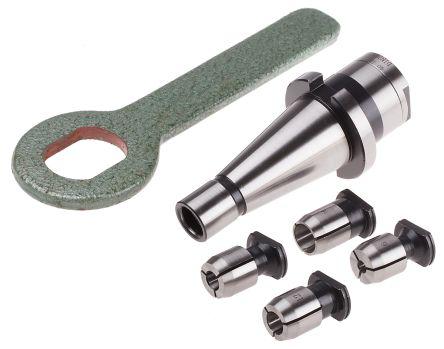 This is 40-INT Lathe Chuck with 6 10 12 16 mm Collets manufactured by RS Pro. The manufacturer part number is 523-0622. It is supplied with a 6, 10, 12, 16 mm collets . It has a taper size of 40-int .