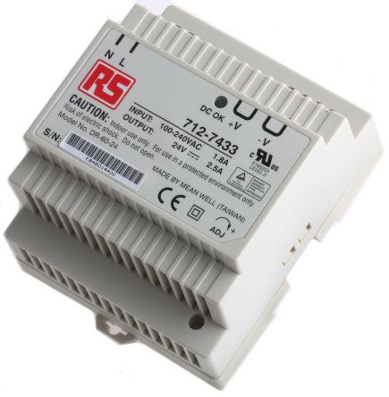This is 60W Switch Mode DIN Rail Panel Mount Power Supply 24V dc/ 2.5A manufactured by RS Pro. The manufacturer part number is 712-7433. The product has +60°c maximum temperature. It has a/an dc output voltage . The given dimensions of the product include 78 x 56 x 93mm. While its minimum temperature is -20°c. It has ac input voltage. It provides robust protection features, such as over voltage protection, overload protection, short circuit protection. Furthermore, the product is 56mm wide. The MTBF values include 216200h. Its output voltage (maximum) includes 26.4v dc. Its electrical phase configuration includes 1. The product is available in din rail configuration. It comes in switch mode configuration. Additionally, its holdup time is about 23 ms @ 115 v ac, 100 ms @ 230 v ac . Load Regulation - ±1%. The product complies with all safety standards, such as en 50178, rohs compliant, tuv en 60950-1, ul 508. While its maximum input current includes 0.8 a @ 230 v ac, 1.2 a @ 115 v ac. It has 47 → 63hz input frequency range . It is a highly efficient product with an 84% of high efficiency. Its input voltage is 88 → 264v ac. Additionally, the product is supplied with 1 outputs. It has 21.6 → 26.4v of output voltage adjustment range. Has a line regulation of ±1%. Carries 150mv pk-pk ripple and noise. The product comes in 93mm depth. The product features 21.6v dc minimum output voltage. The product also provides special features, such as cooling by free air convection, installed on din rail ts-35/7.5 or 15, isolation class ii, led indicator for power on, universal ac input/full range, 3-years warranty, 100% full load burn-in test. It has a single phase input electrical phase . In addition, it has ac-dc type power signal conversion . The typical product's weight is 0.3kg. It carries 2.5 a output current. Applications Information involves commercial & residential household appliances & building automation controls. Features a 24 v dc output voltage. Feature 60w of power rating. 264v ac is the maximum voltage of the bespoke product. The product has 88v ac of minimum input voltage.