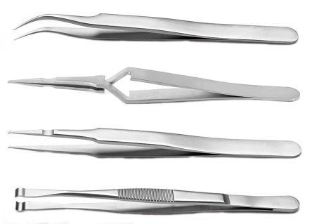 This is 4 piece Stainless Steel Tweezer Set with Various Contents manufactured by RS Pro. The manufacturer part number is 136-9884. Moreover, it has bent tweezers, curved tweezers, grooved tweezers, precision tweezers set contents . The product is made from highly stable and reliable stainless steel. The product consists of 4 pieces.