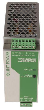 This is QUINT Switch Mode DIN Rail Panel Mount Power Supply 60W 24V dc/ 2.5A manufactured by Phoenix Contact. The manufacturer part number is QUINT-PS-100-240AC/24DC/2.5. The product has +70°c maximum temperature. It has a/an dc output voltage . The given dimensions of the product include 125 x 55 x 130mm. While its minimum temperature is -25°c. It has ac input voltage. Furthermore, the product is 55mm wide. The MTBF values include 500000h. Its output voltage (maximum) includes 28.5v dc. Its electrical phase configuration includes 1. It comes in switch mode configuration. Load Regulation - ±1%. It is a highly efficient product with an 86% of high efficiency. Has a line regulation of ±0.1%. Carries 10mv pk-pk ripple and noise. The product comes in 130mm depth. The product features 22.5v dc minimum output voltage. It has a single phase input electrical phase . It carries 2.5 a output current. The typical product's weight is 850g. The product quint, is a highly preferred choice for users. Features a 24 v dc output voltage. Feature 60w of power rating. 264v ac is the maximum voltage of the bespoke product. The product has 85v ac of minimum input voltage.