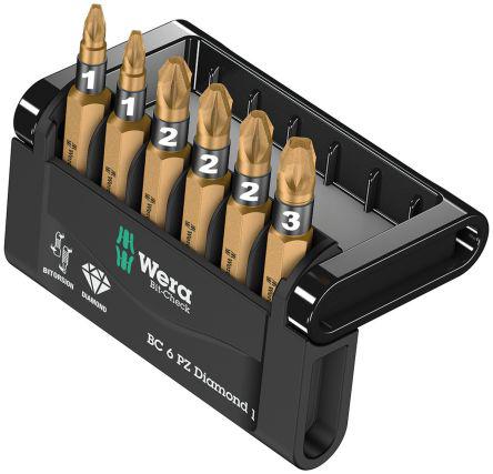 This is 6 pieces Diamond Tipped Impact Driver Bit Driver Bit Set PZ1 x 50 (2) PZ2 x 50 (3) PZ3 x 50 manufactured by Wera. The manufacturer part number is 05057402001. The product consists of 6 pieces. The product is made from highly stable and reliable diamond tipped. It comes in impact bit set configuration. It has a pozidriv head and is ideal choice for a variety of demanding applications. The product is available in pz1 x 50 (2), pz2 x 50 (3), pz3 x 50 size.