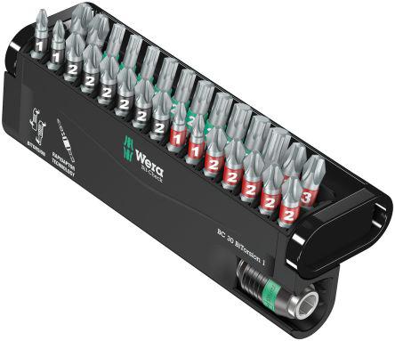 This is 30 pieces Impact Driver Bit Driver Bit Set manufactured by Wera. The manufacturer part number is 05057430050. The product consists of 30 pieces. It has a hexagon, phillips, pozidriv, torx head and is ideal choice for a variety of demanding applications. It comes in impact driver bit configuration. The product is available in bit holder: 1/4 in x 50, phillips: ph1 x 25 (2), phillips: ph2 x 25 (5), phillips: ph3 x 25 (2), pozidriv: pz1 x 25 (2), pozidriv: pz2 x 25 (6), pozidriv: pz3 x 25 (2), torx: tx10 x 25, torx: tx15 x 25 (2), torx: tx20 x 25 (2), torx: tx25 x 25 (2), torx: tx30 x 25 (2), torx: tx40 x 25 size.