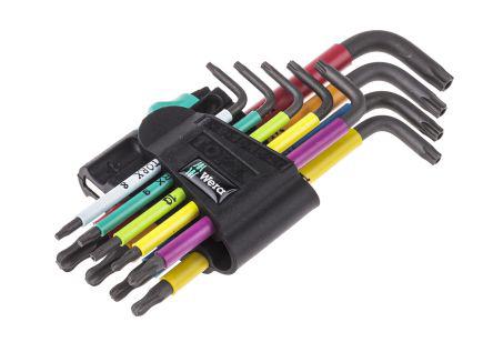 This is 2 (Clips) 9 (Keys) Piece L Shape Torx Key Set manufactured by Wera. The manufacturer part number is 967/9 TX BO Multicolour 1 SB. A quality product with a nice blacklaser finish. The product is made from highly stable and reliable plastic (sleeve). It is a l product with unique specifications. Moreover, it has (2) component clips, tx 10 x 85 mm l-key, tx 15 x 90 mm l-key, tx 20 x 96 mm l-key, tx 25 x 104 mm l-key, tx 27 x 112 mm l-key, tx 30 x 122 mm l-key, tx 40 x 132 mm l-key, tx 8 x 76 mm l-key, tx 9 x 79 mm l-key set contents . Additionally, it has a long arm . The product consists of 2 (clips), 9 (keys) pieces.