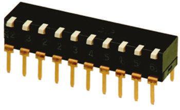 This is 10 Way Through Hole DIP Switch SPST Lever Actuator manufactured by Omron. The manufacturer part number is A6TR-0104.