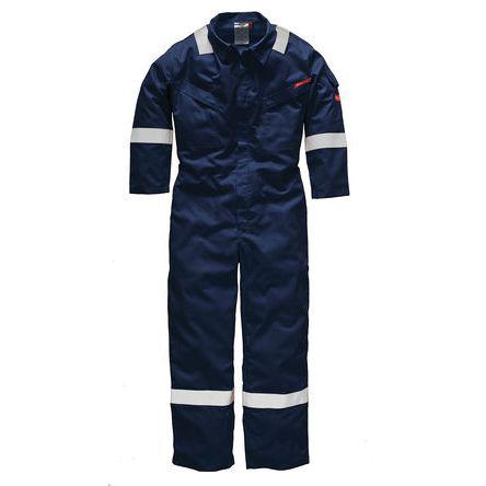 This is Blue Flame Retardant Coverall L manufactured by Dickies. The manufacturer part number is FR5401 Lightweight Pyrovatex Coverall Navy 54T. It is a zipper closure with unique specifications. Additionally, the product is designed with coverall Style. It is created with a standard 54in chest size . In addition, men is the available "Gender" of the product. It has a decent blue colour. The product is made from highly stable and reliable cotton. Additionally, it has a standard 33in inside leg . Its accurate length is tall. In addition, the product is reusable . Its material offers a/an flame retardant properties . The product is available in l size.