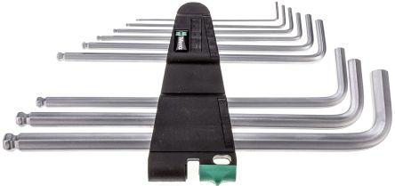 This is L Shape Long Arm Hex Key Set 9 pieces manufactured by Wera. The manufacturer part number is 05022087001 950 PKL/9 SM N. It is available in metric package. It has a ball end type hex key . A quality product with a nice chrome finish. It is a l product with unique specifications. Its hex key size is about 1.5mm . Additionally, it has a long arm . The product consists of 9 pieces.