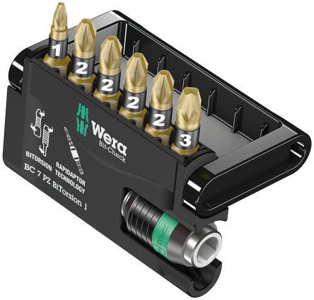 This is 7 pieces Screw Driver Bit-Check set Driver Bit Set 1/4 in PZ 1 PZ 2 PZ 3 manufactured by Wera. The manufacturer part number is 05340260001. The product consists of 7 pieces. It has a hexagon, pozidriv head and is ideal choice for a variety of demanding applications. It comes in driver bit set configuration. The product is available in pz 1, pz 2, pz 3, 1/4 in size.