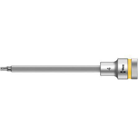 This is 4mm with 1/2 in Drive Socket Hex 140 mm manufactured by Wera. The manufacturer part number is 05003840050. A quality product with a nice chrome finish. The product features a hexagon drive. The product is made from highly stable and reliable chrome vanadium. It has an overall length of 140 mm. The socket's size is 4mm. The product has a drive size of 1/2 in. Its bit is about 101.5mm in length . The hexagon socket offers profound benefits and is well-designed.