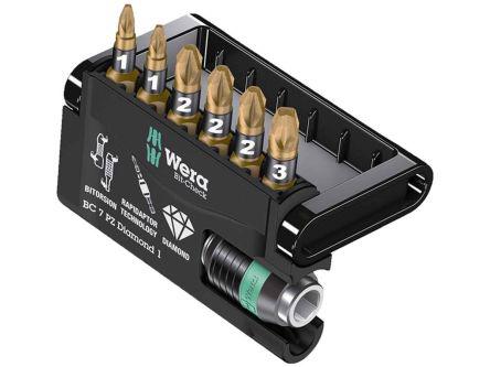 This is 7 pieces Diamond (Coated) Screw Driver Bit-Check set Driver Bit Set 1/4 in PZ 1 PZ 2 PZ 3 manufactured by Wera. The manufacturer part number is 05073534001. The product consists of 7 pieces. The product is made from highly stable and reliable diamond (coated). It comes in driver bit set configuration. It has a hexagon, pozidriv head and is ideal choice for a variety of demanding applications. The product is available in pz 1, pz 2, pz 3, 1/4 in size.