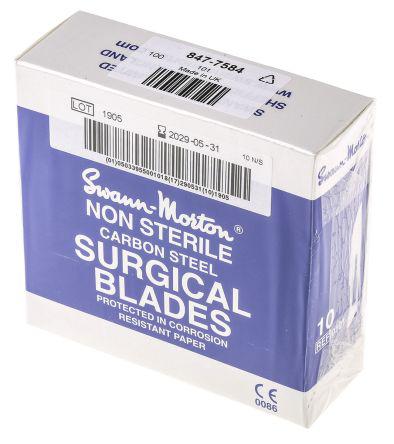 This is No.10 Carbon Steel Scalpel Blade manufactured by Swann-Morton. The manufacturer part number is RS_847-7584. The product is made from highly stable and reliable carbon steel. The blade has a 10 size.