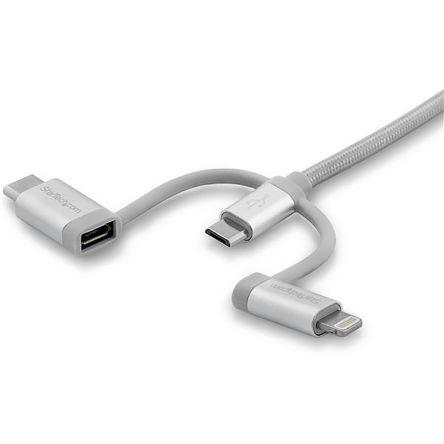 This is USB 2.0 Male USB Type-A to Male Apple Lightning Connector Male USB Micro-B Male USB Type-C 2m USB Cable manufactured by Startech. The manufacturer part number is LTCUB2MGR. While the connector B is male apple lightning connector, male usb micro-b, male usb type-c. It contains a/an usb 2.0 type USB . The connector A is male usb a connector. The sheath has an adorable silver colour. Its accurate length is 2m.