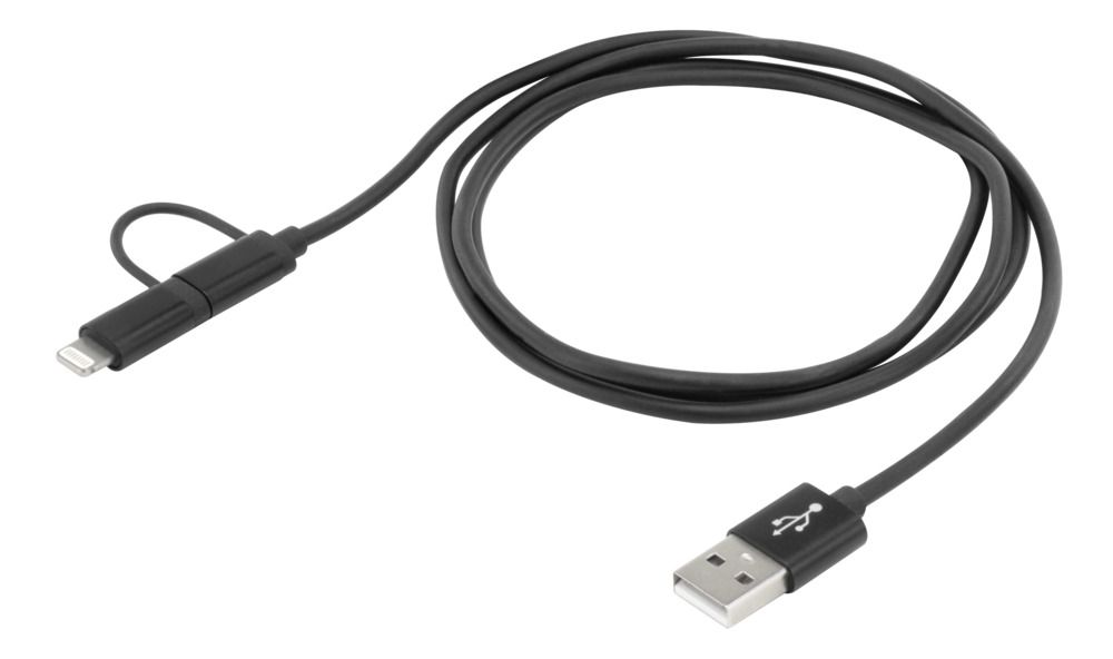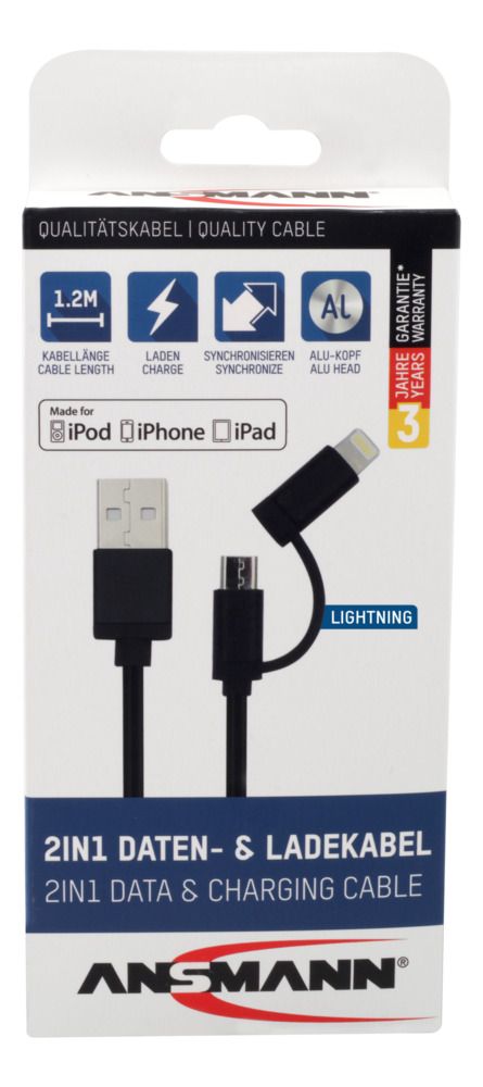 This is USB A Male Apple Lighting Connector Micro USB B USB C 1.2m Cable manufactured by Ansmann. The manufacturer part number is 1700-0136. This connector 1 is a male. Its accurate length is 1.2m. It has a maximised data speed rate of 480mbps. While the Connector 2 is lightning, micro usb b, usb c. Connector 1 is usb a. Additionally, it offers a standard usb cable type USB cable .