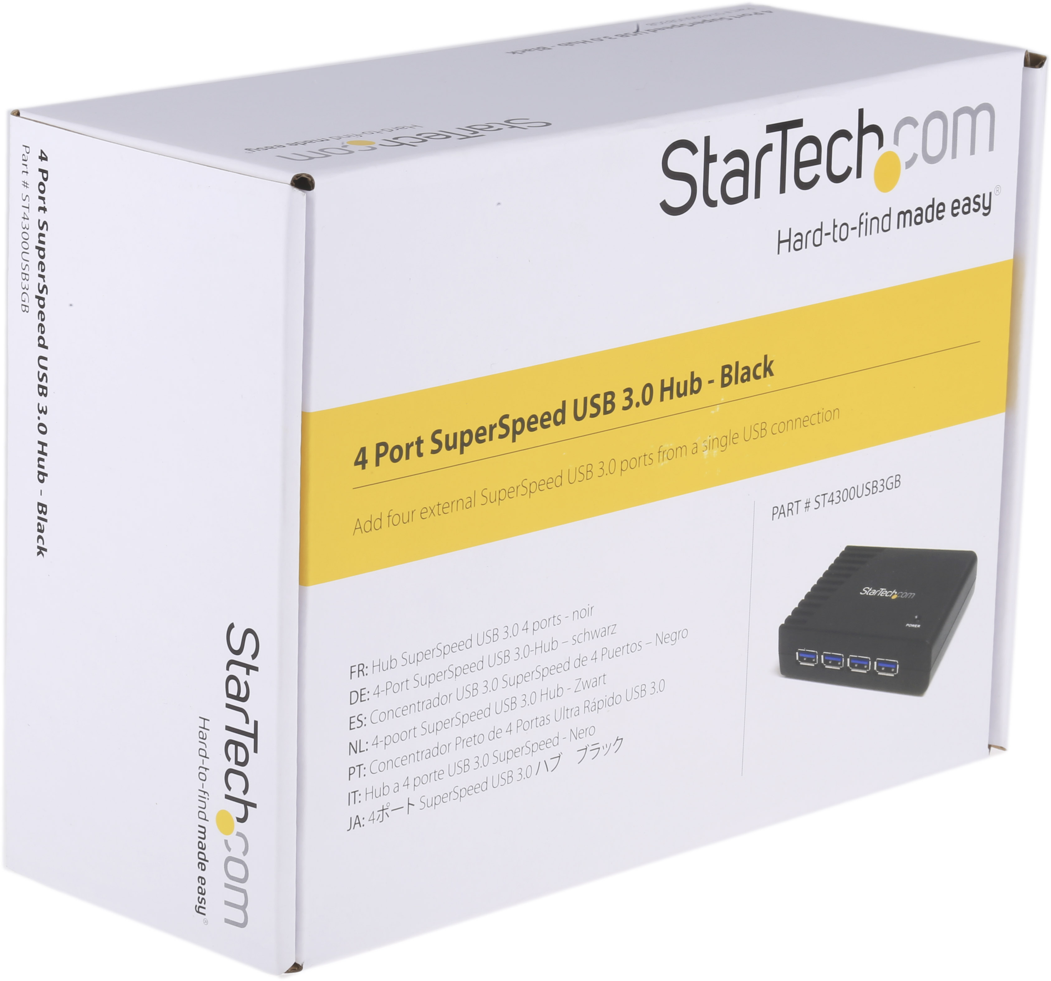 This is 4x USB A Port Hub USB 3.0 - AC Adapter Powered manufactured by StarTech.com. The manufacturer part number is ST4300USB3GB. Additionally, it has a usb 3.0 USB standard . The given dimensions of the product include 95 x 68 x 23mm. Moreover, the product gets power from ac adapter - uk plug. It is designed with a standard usb a type USB connection . In addition, the height is 23mm. Furthermore, the product is 95mm wide. The product comes in 68mm depth. It has a maximised data speed rate of 5gbit/s. In addition, it includes 4 USB ports .
