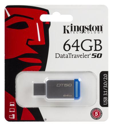 This is DT50 64 GB USB Flash Drive manufactured by Kingston. The manufacturer part number is DT50/64GB. It is tailored for industrial use no . The module has the capacity of 64 gb. It is self-destructive no . The product's typical temperature range incudes 0 → +60°c. Moreover, it has usb 3.0 USB specification . It has a model dt50. It has a/an tlc type Nand .