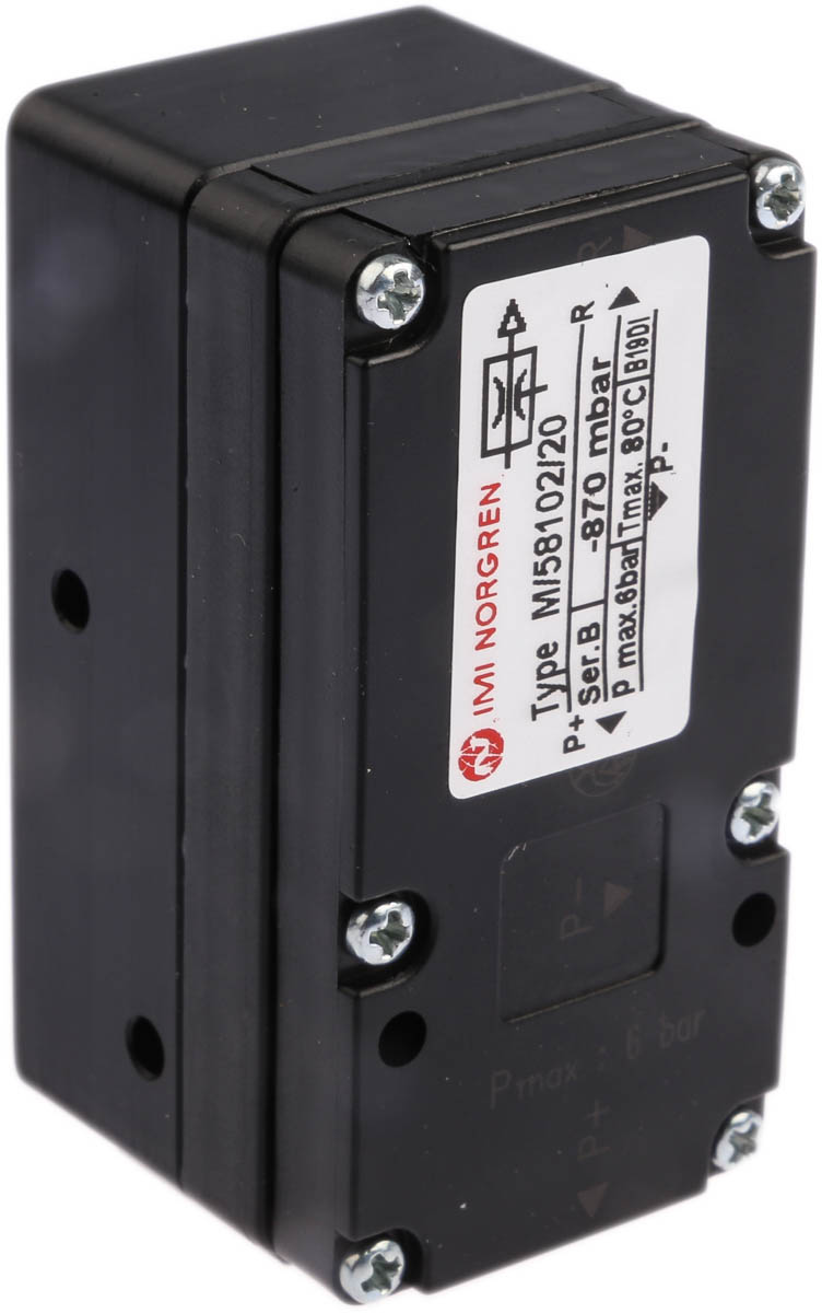This is Vacuum Pump Dia.>7mm 98L/min 6bar -0.87bar manufactured by Norgren. The manufacturer part number is M/58102/20. Furthermore, it has a maximum 6bar input pressure . With an outlet g 3/8 port size . Its nozzle diameter is approximately >7mm . In addition, it has a maximum 160l/min suction flow . It includes a silencer yes . It provides a 6bar of operating pressure. The product has a m/58102 manufacturer series. Whereas, the minimum operating temperature of the product is -20°c. It has a maximum -0.87bar vacuum pressure . It has a maximum operating temperature of +80°c. It has an inlet g 3/8 port size .