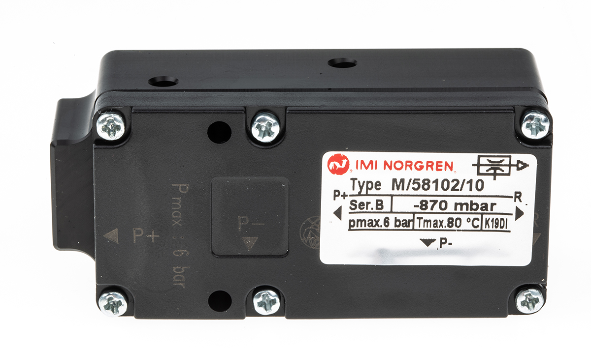 This is IMI Vacuum Pump >7mm nozzle -0.87bar 80L/min M/58102 series manufactured by Norgren. The manufacturer part number is M/58102/10. Furthermore, it has a maximum 6bar input pressure . It has a Vacuum Gauge no Its nozzle diameter is approximately >7mm . In addition, it has a maximum 80l/min suction flow . It includes a silencer yes . It provides a 6bar of operating pressure. The product has a m/58102 manufacturer series. Whereas, the minimum operating temperature of the product is -20°c. It has a maximum -0.87bar vacuum pressure . It has a maximum operating temperature of +80°c.