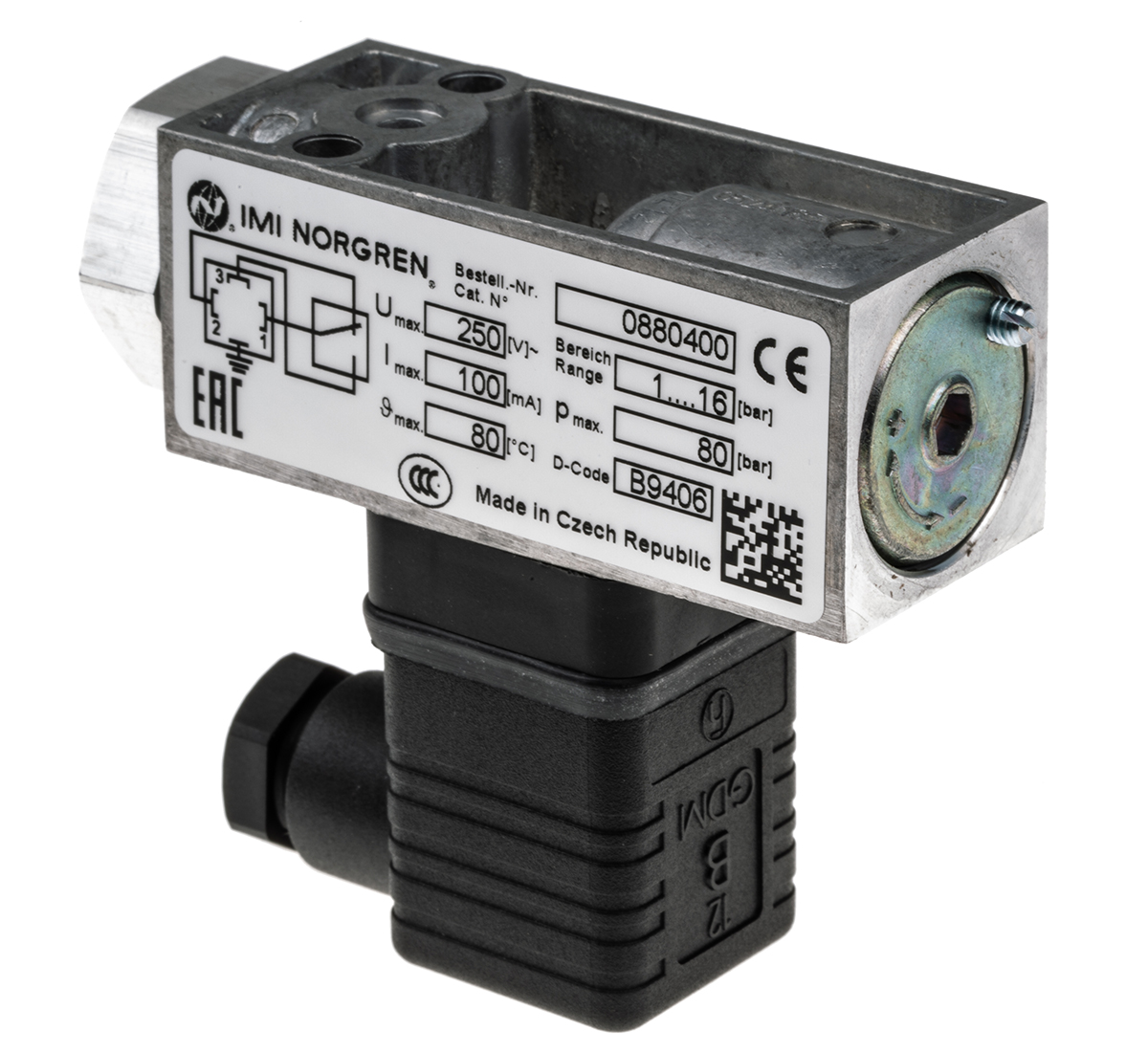 This is IMI Pressure Switch G 1/4 1bar to 16 bar manufactured by Norgren. The manufacturer part number is 0880400000000000. It features 16bar maximum operating pressure. It is IP rated with ip65. It has a minimum 1bar operating pressure . It is suitable for hydraulic, neutral, gaseous, liquid fluid, non-combustible water application, pneumatic, vacuum media . Whereas, the minimum operating temperature of the product is -10°c. It has a maximum operating temperature of +85°c.