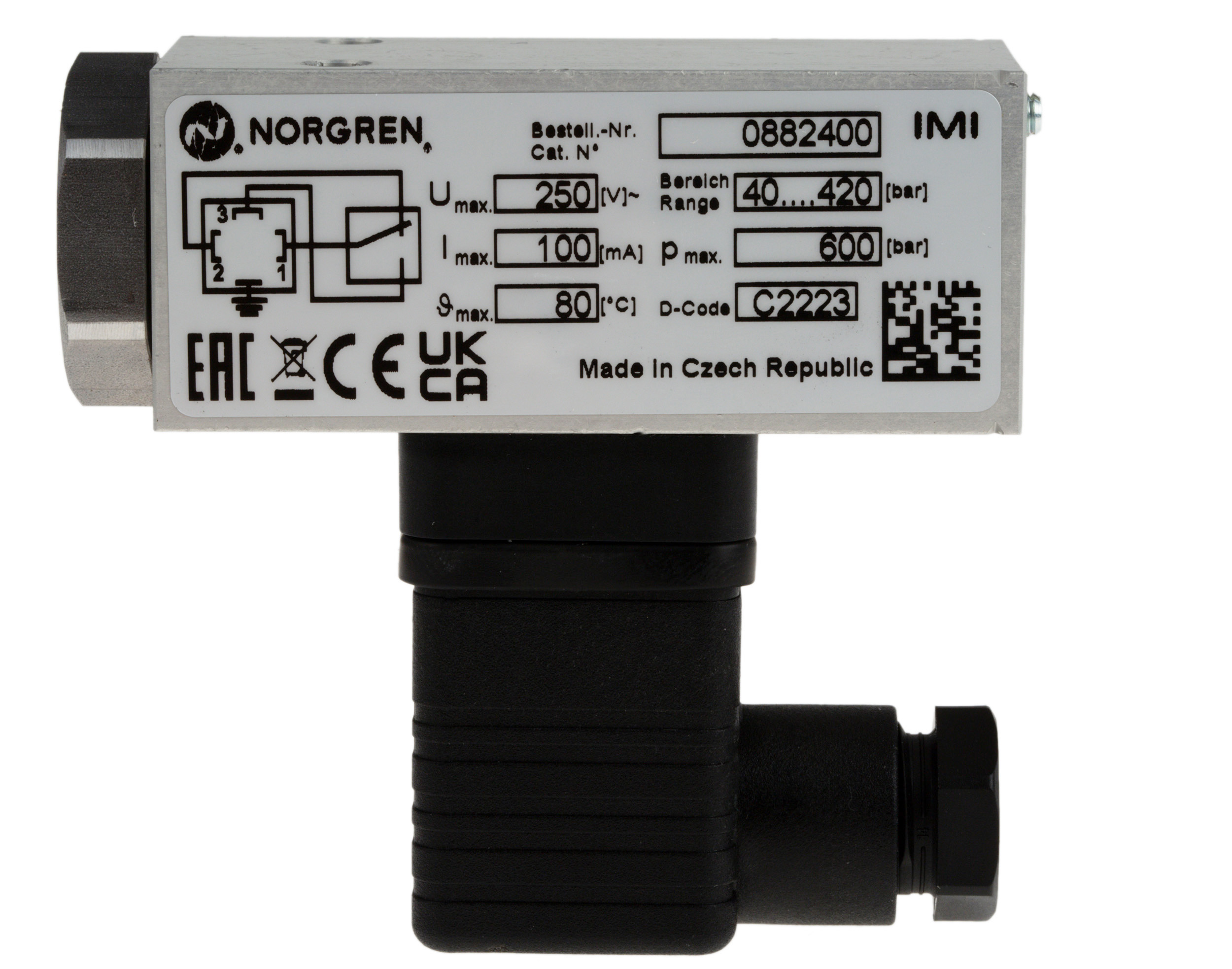 This is IMI Pressure Switch G 1/4 40bar to 420 bar manufactured by Norgren. The manufacturer part number is 0882400000000000. It has a minimum 40bar operating pressure . It is suitable for hydraulic, pneumatic, vacuum media . It features 420 bar maximum operating pressure.