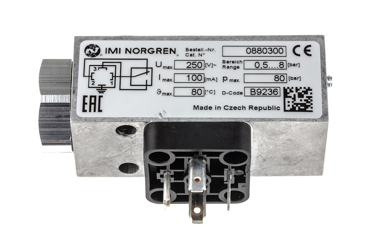 This is Pressure Switch G 1/4 0.5bar to 8 bar manufactured by Norgren. The manufacturer part number is 0880300000000000. It has a male gender thread . It has an adorable g thread connection standard . It features 8bar maximum operating pressure. It is IP rated with ip65. It has a minimum 0.5bar operating pressure . While it is a sort of positive pressure. It is suitable for gas, liquid media . It has a standard g 1/4 connection . The product has a 18d manufacturer series. Whereas, the minimum operating temperature of the product is -10°c. It has a maximum operating temperature of +80°c. Furthermore, it has a/an normally closed, normally open contact operation . Moreover, it has a 1/4 in thread size connection .