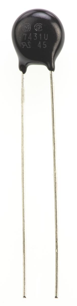 This is ZNR Series Metal Oxide Varistor 120pF 10A Clamping 710V Varistor 430V manufactured by Panasonic. The manufacturer part number is ERZV07D431. It has about 430v varistor voltage . Its diameter is 8.5mm. The given dimensions of the product include 8.5 (dia.) x 5.6mm. The clamping voltage is about 710v . The product znr, is a highly preferred choice for users. It carries an energy of 40j. The product has a maximum 275v AC voltage rating . It is 5.6mm thick. It provides a 120pf of capacitance value. The lead features 5mm pitch. Its clamping current is approximately 10a . It can withstand a maximum 1750a surge current . It has a maximum 350v DC voltage rating .