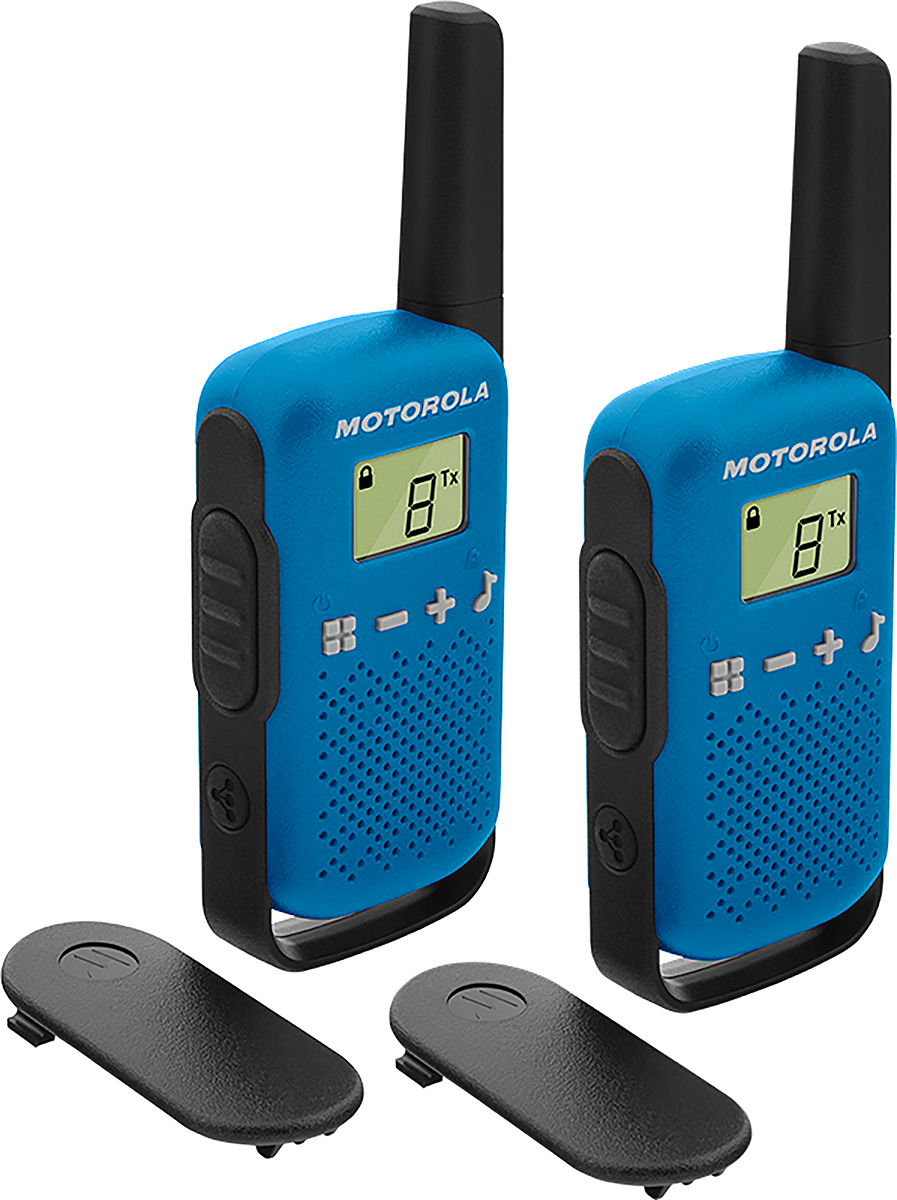 This is Talkabout T42 Blue Twin Pack manufactured by Motorola. The manufacturer part number is B4P00811LDKMAW. It has an LCD display included yes . It has a radio style handheld . Its battery life is about 18h . It is supplied with 16 channels. Furthermore, the product has 446mhz operating frequency range. It has a model talkabout t42. It has a charge indicator characteristic yes .