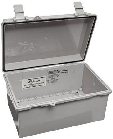 This is NBB Wall Box ABS PC Grey 11.28 x 7.47 x 5.5in manufactured by Bud. The manufacturer part number is NBB-15243. The product complies with all safety standards, such as culus e194432, ul 508, ul 94. It has a latch type door lock . The product nbb, is a highly preferred choice for users. It has a decent grey colour. It has an external depth of 139.7mm. Applications Information involves electrical. The product's body is nicely designed from abs, pc materials. Features 286.5 x 189.7 x 139.7mm external caliber. While its external height is 286.5 mm. The product is 189.7 mm wide.