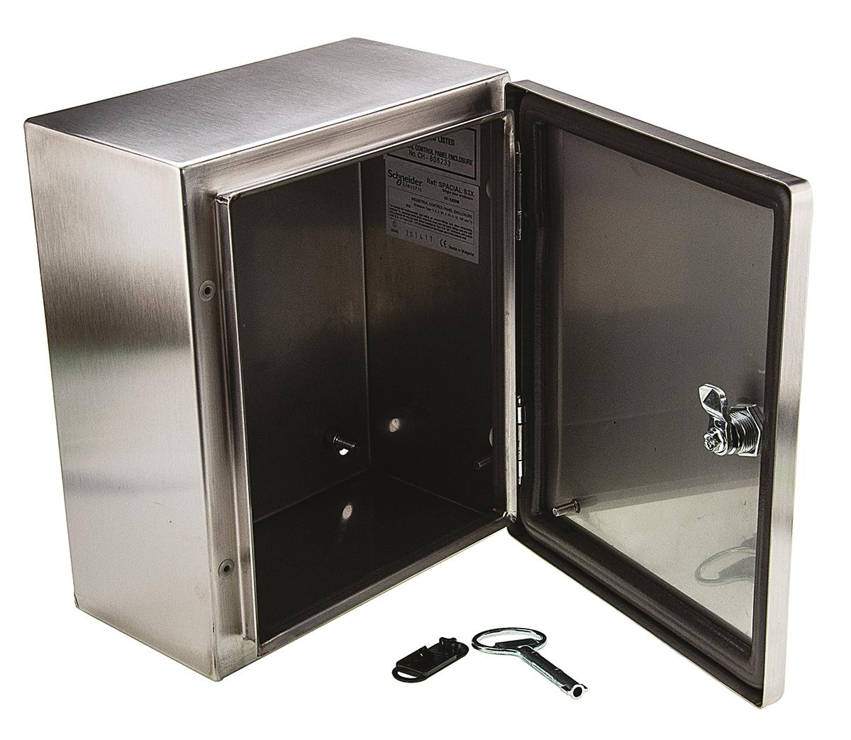 This is Spacial S3X IP66 Wall Box 304 Stainless Steel Unpainted 300 x 250 x 150mm manufactured by Schneider Electric. The manufacturer part number is NSYS3X302515. Its external mounting is of bracket type . It is IP rated with ip66. The product spacial s3x, is a highly preferred choice for users. It has a decent unpainted colour. It contains a gland plate no . It includes a chassis plate no . It has a transparent door no . It has an external depth of 150mm. It has a double bar type door lock . The product's body is nicely designed from 304 stainless steel materials. Additionally, it has a panel type internal mounting . While its external height is 300 mm. It has a fixing kit no . The product also provides special features, such as 120° door opening. The product is 250 mm wide. It has a standard ik10 IK rating . It is rated with ip66. The product is made from highly stable and reliable metal, stainless steel. The product is rohs3 compliant. Features a typical area dimensions of 116in² (748cm²). A type of enclosure container. It is shipped in box package . The product's diameters include 11.811" l x 9.843" w (300.00mm x 250.00mm). It has a long 4 weeks standard lead time. Its typical moisture sensitivity level is 1 (unlimited). It has a classic gray colour. In addition, the height is 5.906" (150.00mm). Design Information: cover included.