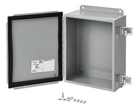 This is Wall Box Steel Grey 203 x 152 x 89mm manufactured by Hoffman Enclosures. The manufacturer part number is A806CHQR. Its external mounting is of bracket type . It has a latch type door lock . It has a decent grey colour. It is specifically designed for the protection of instrumentation . It has an external depth of 89mm. Applications Information involves electrical. The product's body is nicely designed from steel materials. Features 203 x 152 x 89mm external caliber. It has a transparent door no . While its external height is 203 mm. The product also provides special features, such as bonding provision on door, oil-resistant gasket, seams continuously welded and ground smooth. The product is 152 mm wide.