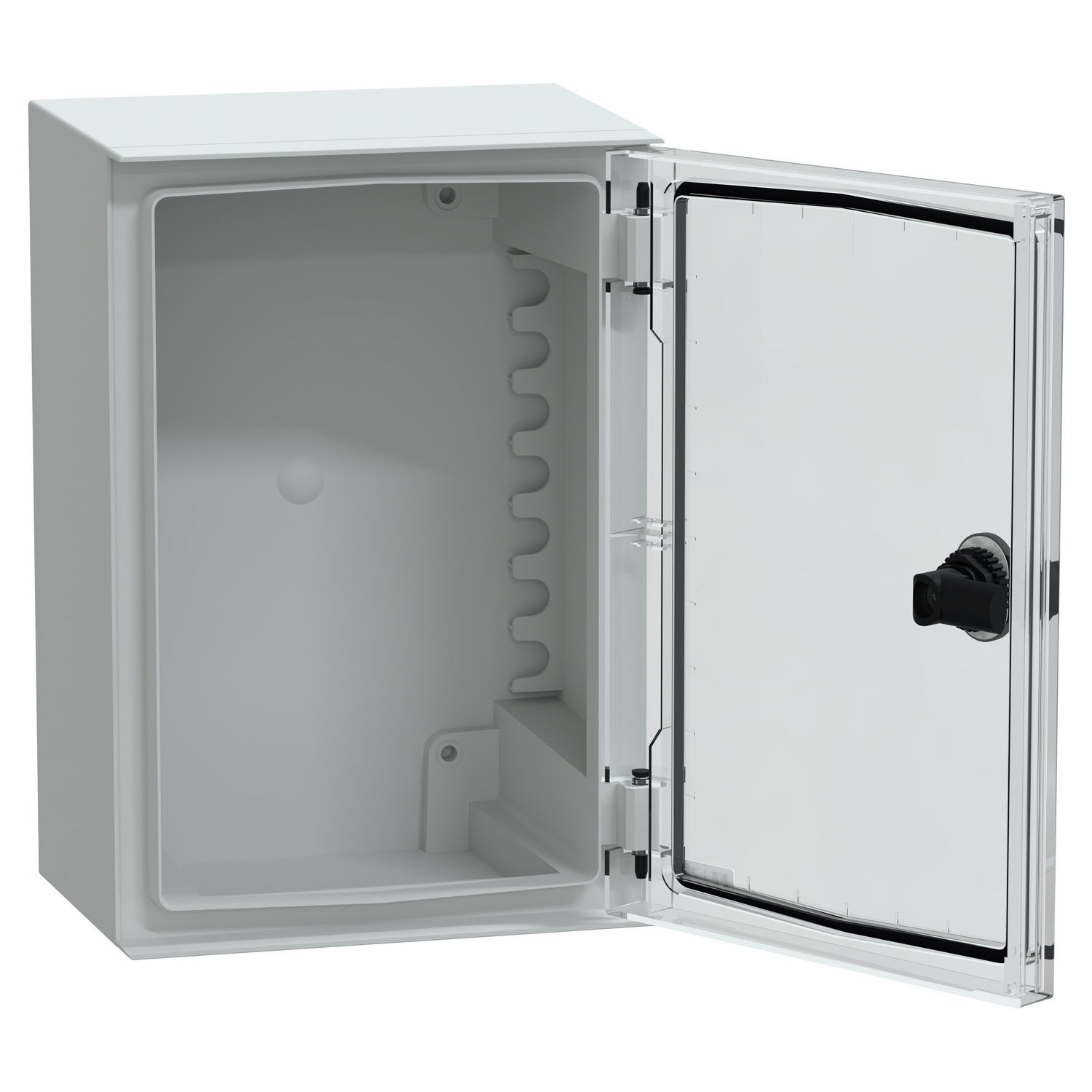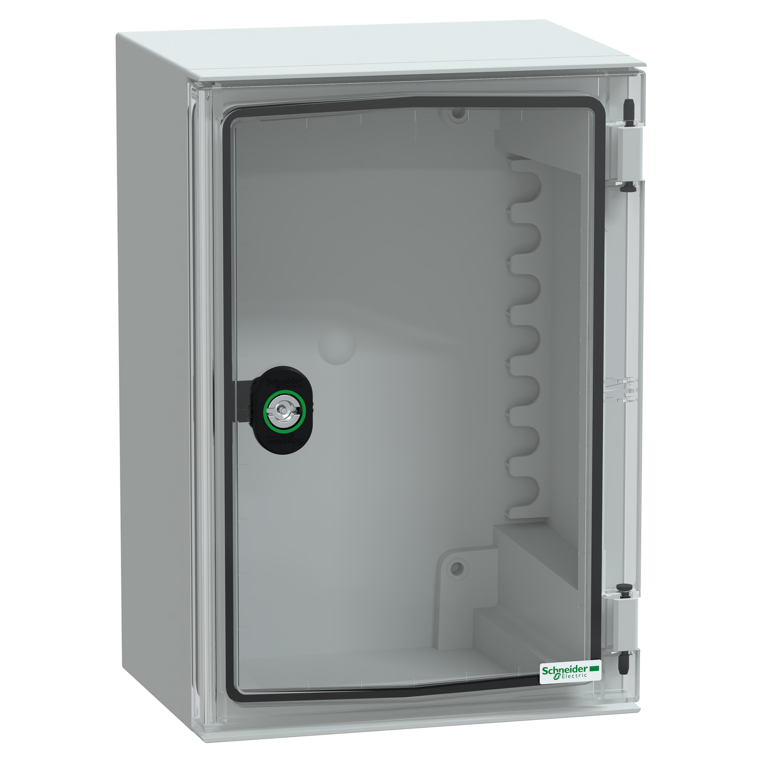 This is Thalassa PLM IP66 Wall Box PET Grey 310 x 215 x 160mm manufactured by Schneider Electric. The manufacturer part number is NSYPLM32TG. Its external mounting is of bracket type . It has a double bar type door lock . It has a transparent door yes . It includes a chassis plate no . It has an external depth of 160mm. It has a fixing kit no . It is IP rated with ip66. It has a decent grey colour. It is specifically designed for the protection of instrumentation . The product's body is nicely designed from polyester materials. The product also provides special features, such as flame resistant. Its RAL code is ral 7035 . Better World Verification Options - green premium. Is it a better world product? yes. The product panelset, is a highly preferred choice for users. It contains a gland plate no . Additionally, it has a panel type internal mounting . While its external height is 310 mm. The product is 215 mm wide. It has a standard ik10 IK rating .