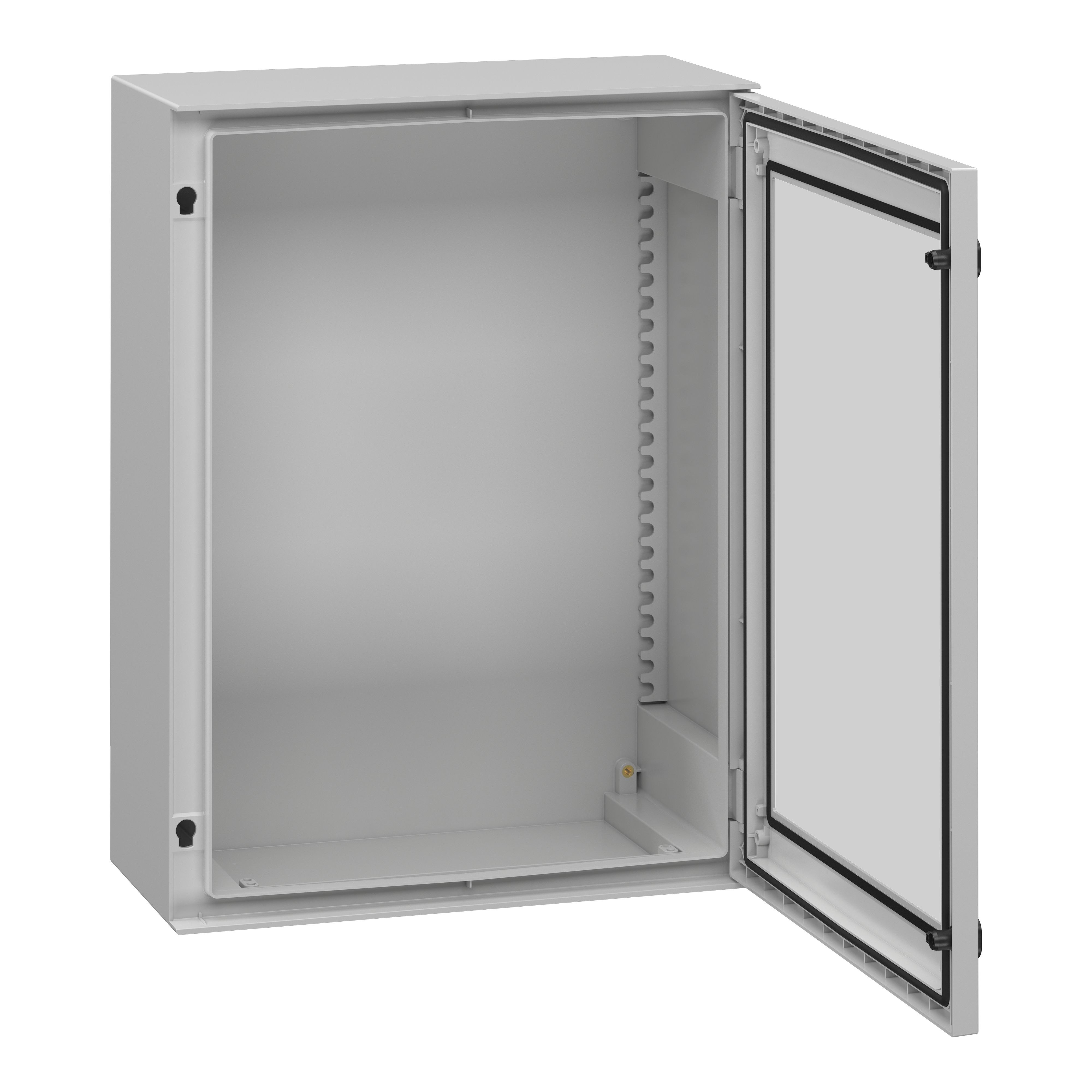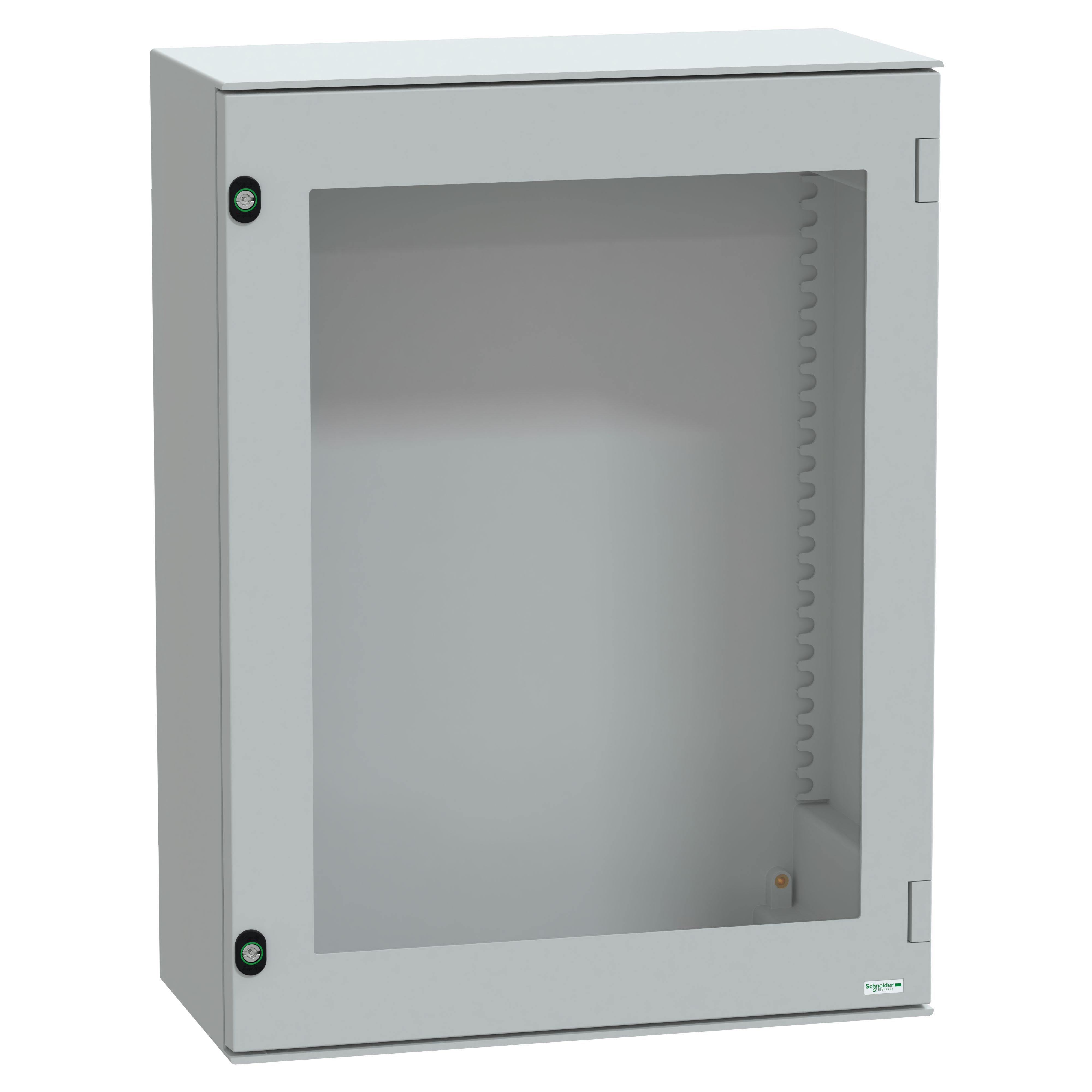 This is Thalassa PLM IP66 Wall Box PET Grey 847 x 636 x 300mm manufactured by Schneider Electric. The manufacturer part number is NSYPLM86TG. Its external mounting is of bracket type . It has a double bar type door lock . It has a transparent door yes . The product complies with all safety standards, such as ul. It includes a chassis plate no . It has an external depth of 300mm. It has a fixing kit no . It is IP rated with ip66. It has a decent grey colour. It is specifically designed for the protection of instrumentation . The product's body is nicely designed from polyester materials. The product also provides special features, such as flame resistant. Its RAL code is ral 7035 . Better World Verification Options - green premium. Is it a better world product? yes. Applications Information involves general purpose. The product panelset, is a highly preferred choice for users. It contains a gland plate no . Additionally, it has a panel type internal mounting . While its external height is 847 mm. The product is 636 mm wide. It has a standard ik08 IK rating .