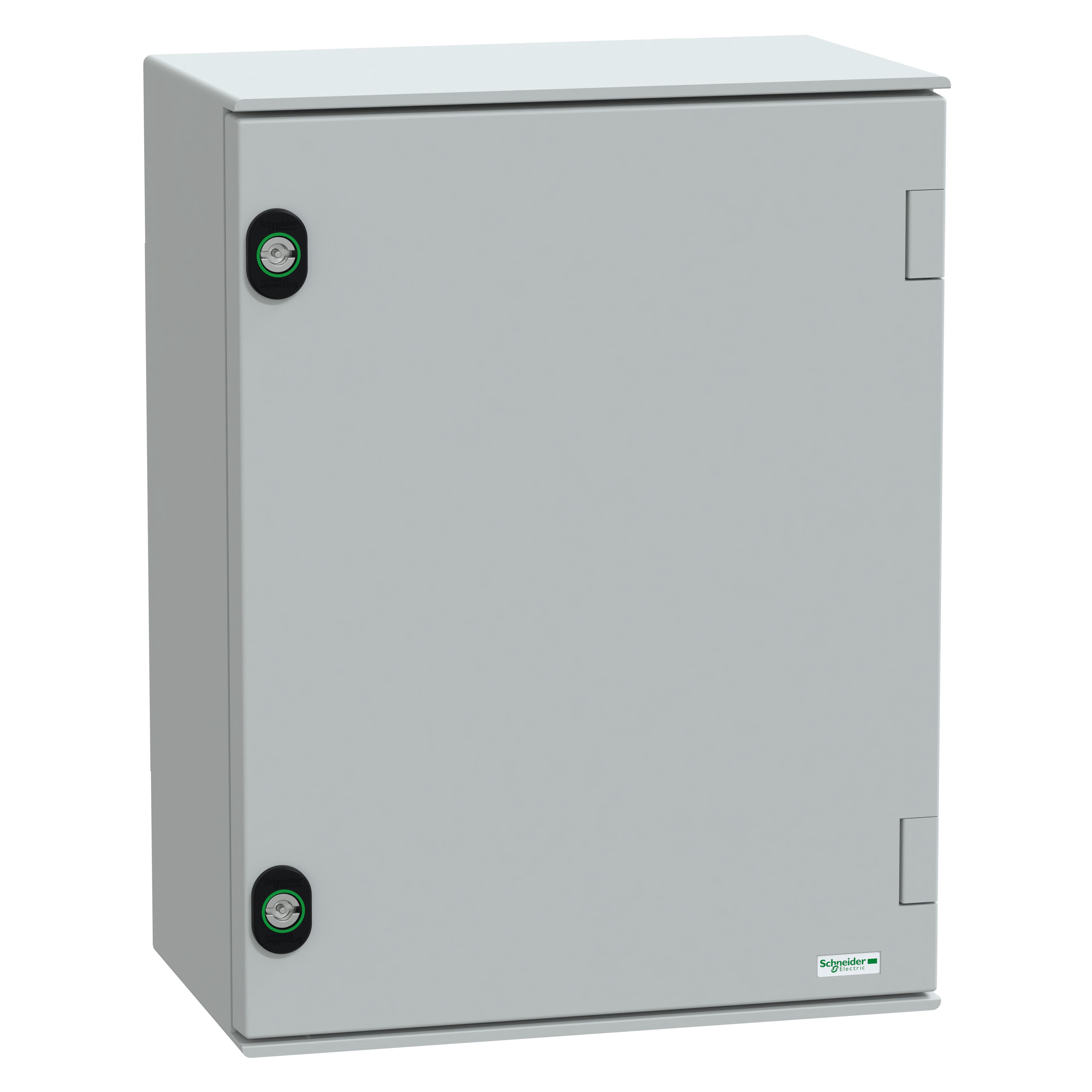 This is Fibreglass Reinforced Polyester Wall Box IP66 200mm x 430 mm x 330 mm manufactured by Schneider Electric. The manufacturer part number is NSYPLM43PG. Better World Verification Options - green premium. Is it a better world product? yes. It is IP rated with ip66. The product panelset, is a highly preferred choice for users. It has an external depth of 200mm. The product's body is nicely designed from fibreglass reinforced polyester materials. While its external height is 430 mm. The product is 330 mm wide.