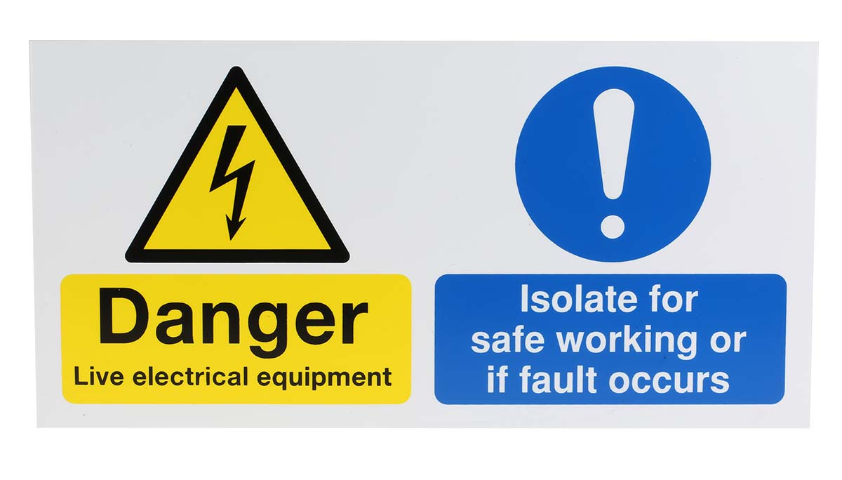 This is Electrical Safety Sign with English Text PP 300 x 150mm Hazard Warning manufactured by RS Pro. The manufacturer part number is 763-1711. It has a/an sign type sign . Its text message shows danger live electrical equipment - isolate for safe working or if fault occurs . It is created for electrical type hazard . It has a decent black/blue/white/yellow colour. The product is made from highly stable and reliable pp. In addition, the height is 150 mm. Furthermore, the product is 300mm wide. Additionally, it is self-adhesive no . It includes a symbol and text . However, its text language is english . In addition, it displays electrical hazard sign description .