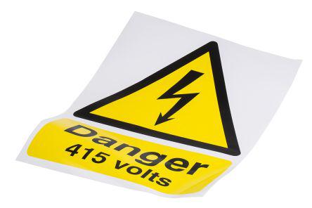 This is Electricity Danger Sign with English Text Vinyl 300 x 400mm Hazard Warning manufactured by RS Pro. The manufacturer part number is 763-1553. It has a/an label type sign . Its text message shows danger 415 volts . Additionally, it is self-adhesive yes . It has a decent black/yellow colour. The product is made from highly stable and reliable vinyl. In addition, the height is 400 mm. Furthermore, the product is 300mm wide. However, its text language is english . In addition, it displays electricity danger sign description .