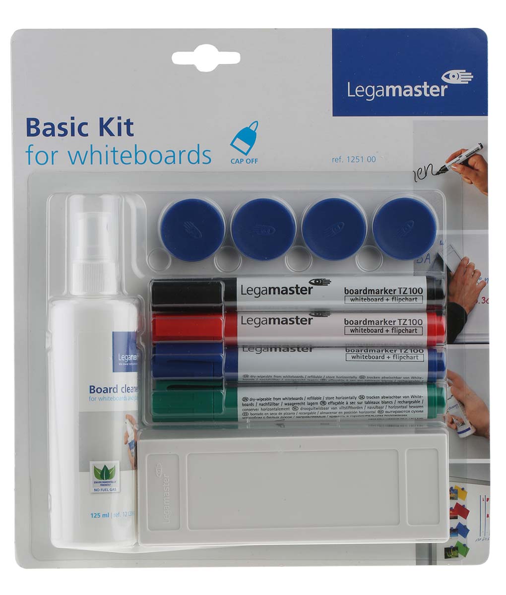 This is Basic Accessory Kit manufactured by Legamaster. The manufacturer part number is 1251-00. In addition, the product has Markers Included yes . 4 are the Number of Markers Included with the product . The product has Erasers Included yes . Moreover, it has Magnets Included yes . Additionally, the product has Cleaners Included yes . It has black, blue, green, red marker colours .